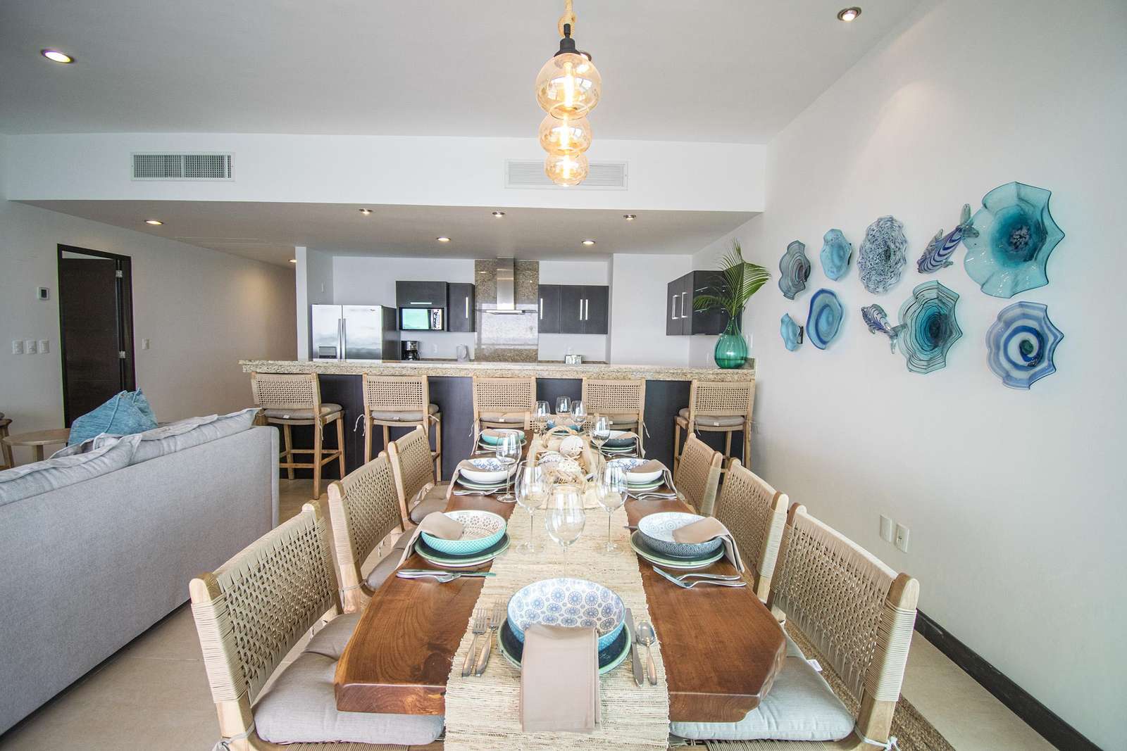 Inside, hundreds of individual touches have each been carefully planned, creating an exceptional standard of an décor elegance. The spacious living room, with a finely upholstered lounge set, resides next to immense picture windows and a pocket glass wall. State-of-the-art features are found throughout, including central air-conditioning, home theater equipment, Wi-Fi and more. The gourmet kitchen has every premium appliance you could want for preparing feasts. Dine around a granite breakfast bar or the regency dining room set.
