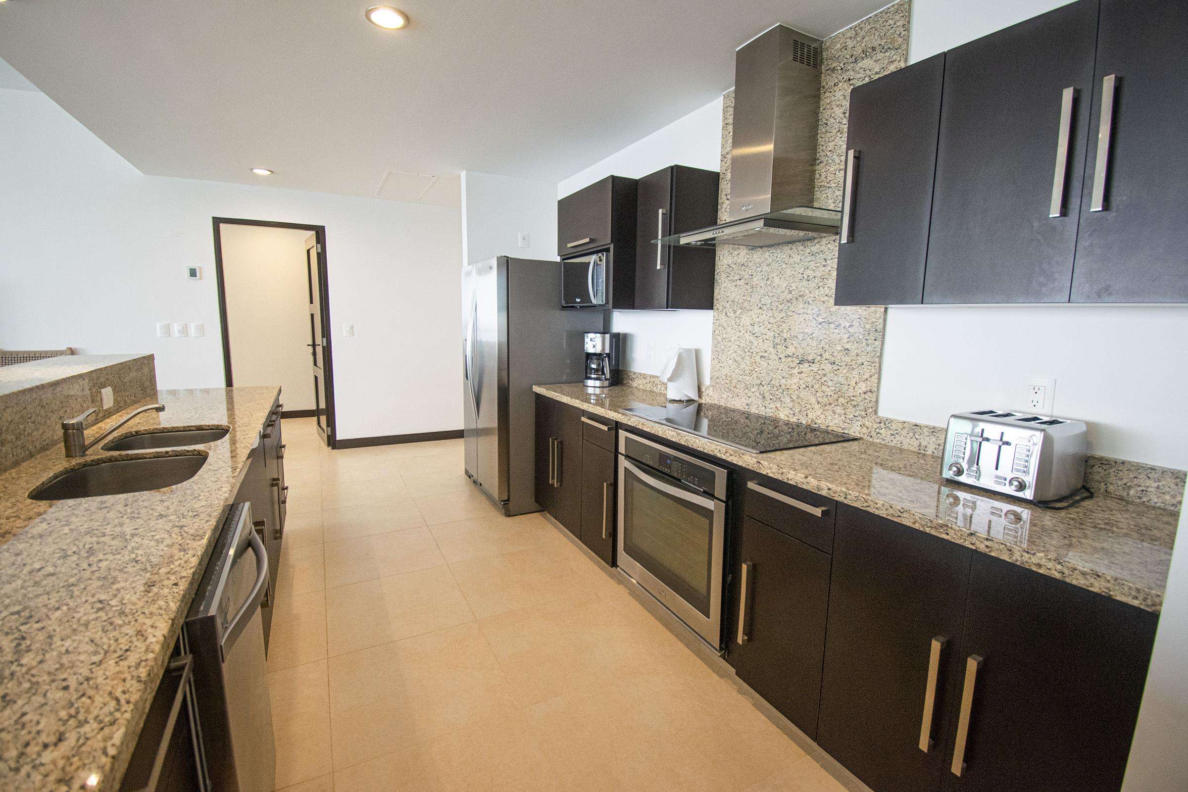 Chef’s Kitchen- fully equipped with refrigerator, stove, microwave, dishwasher, small appliances, and dishes.