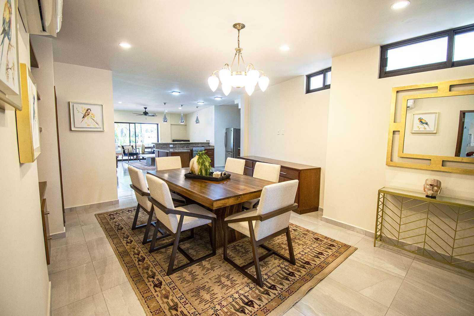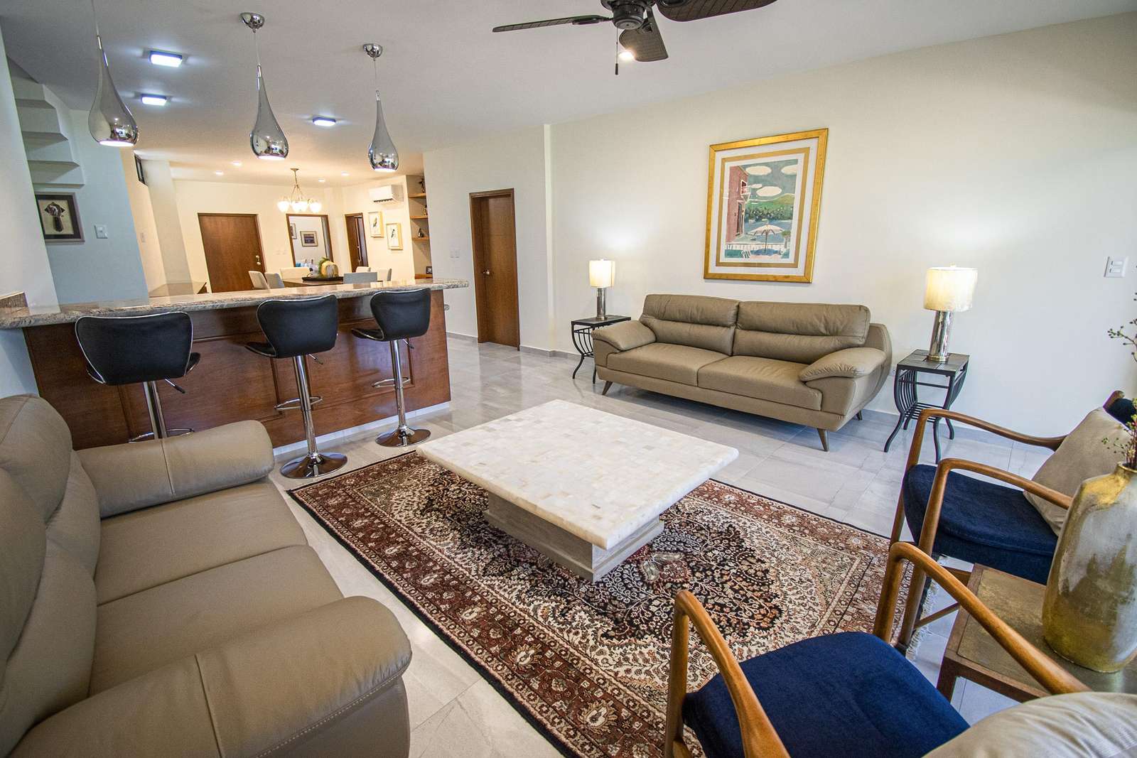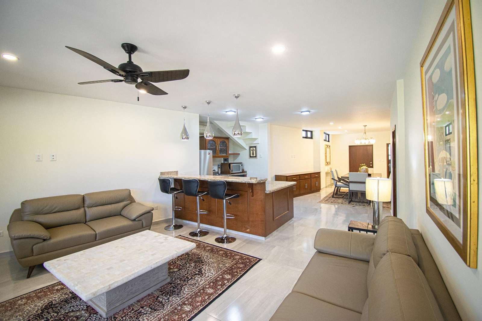 Beautifully framed archways of rich woods combined with marble floors, neutral tones, give a classic hacienda look to the exterior, yet a contemporary feeling to the interiors of this home. The large, open plan living, kitchen and dining areas come together in a symphony of style. The couch makes a perfect place to curl up with a good read, and the dining table is both stately and modern. The kitchen comes fully equipped with lots of counter space and a long breakfast bar.