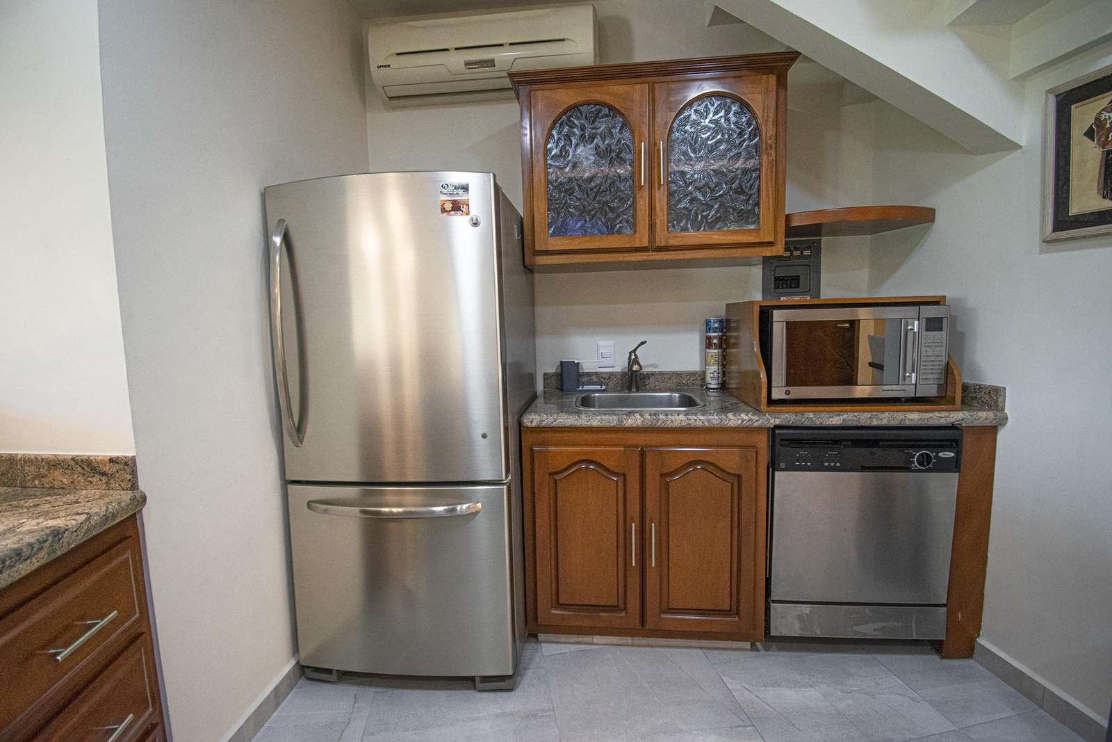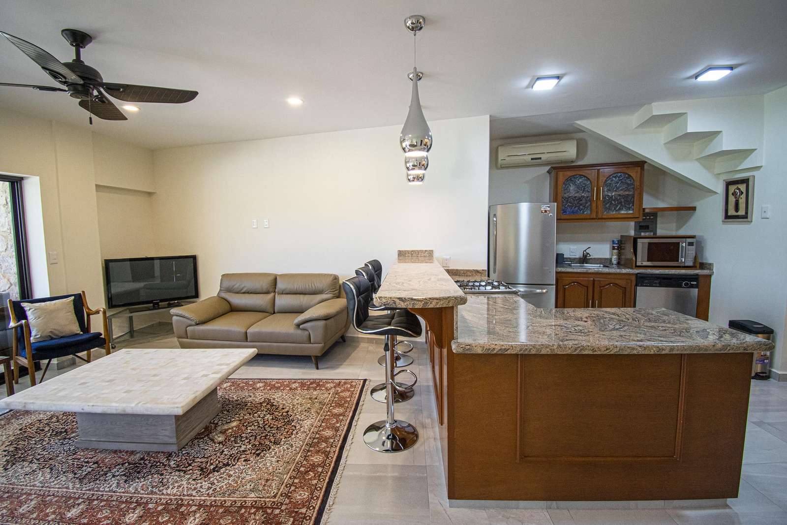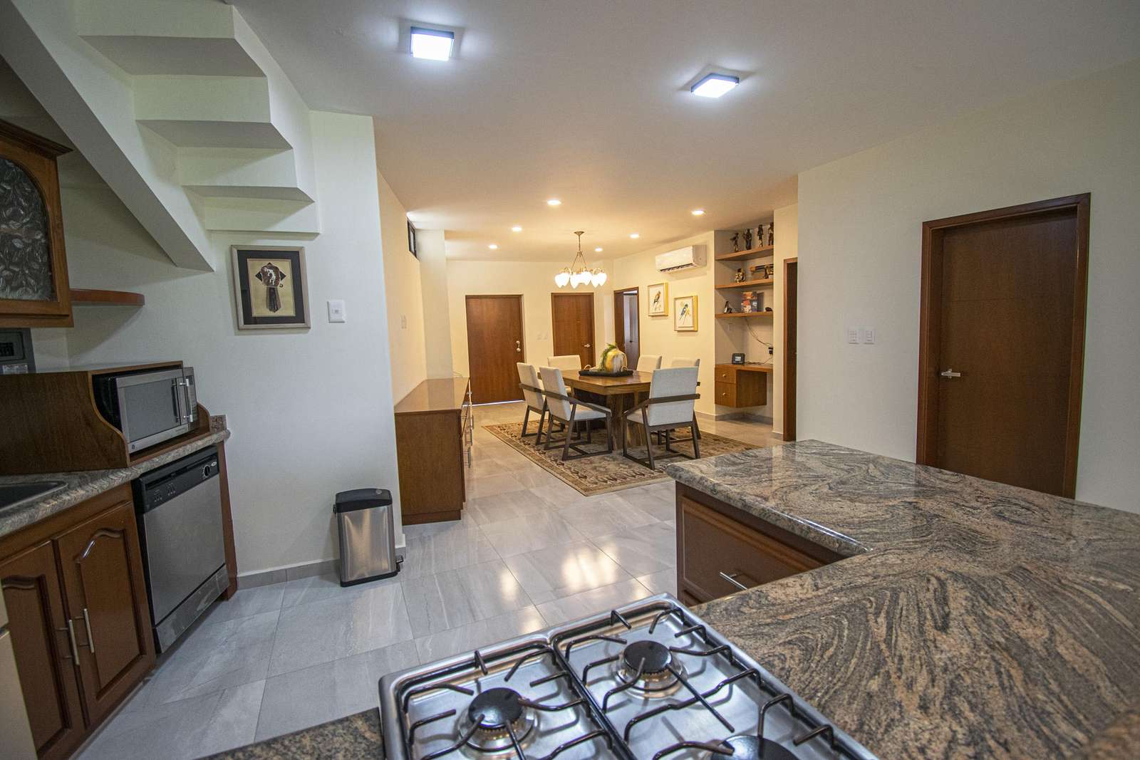Beautifully framed archways of rich woods combined with marble floors, neutral tones, give a classic hacienda look to the exterior, yet a contemporary feeling to the interiors of this home. The large, open plan living, kitchen and dining areas come together in a symphony of style. The couch makes a perfect place to curl up with a good read, and the dining table is both stately and modern. The kitchen comes fully equipped with lots of counter space and a long breakfast bar.