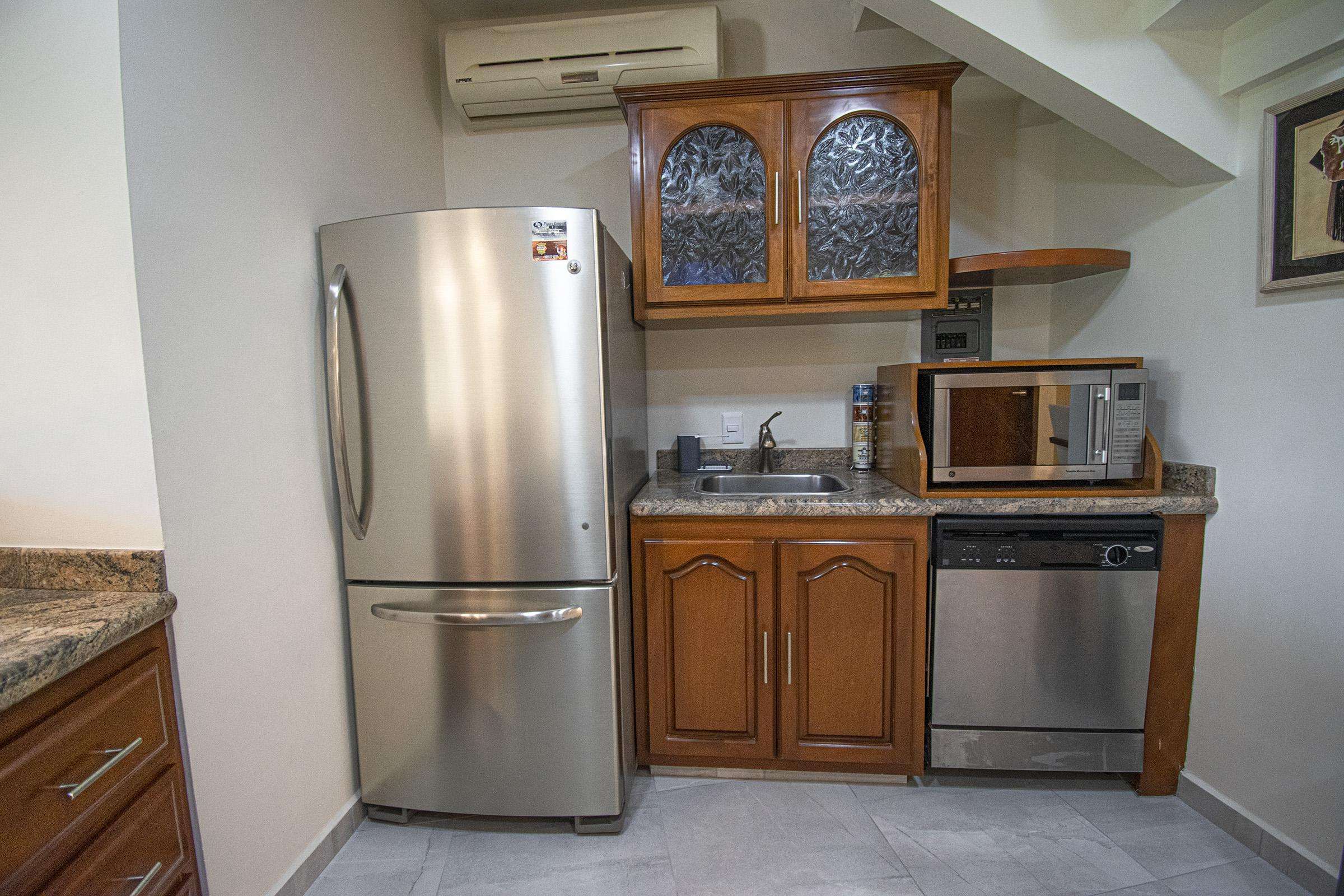 Gourmet Kitchen- fully equipped with refrigerator, stove, microwave, small appliances, and dishes.