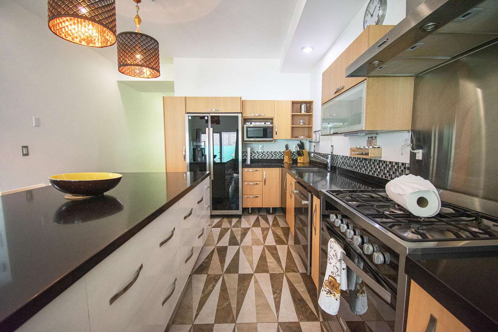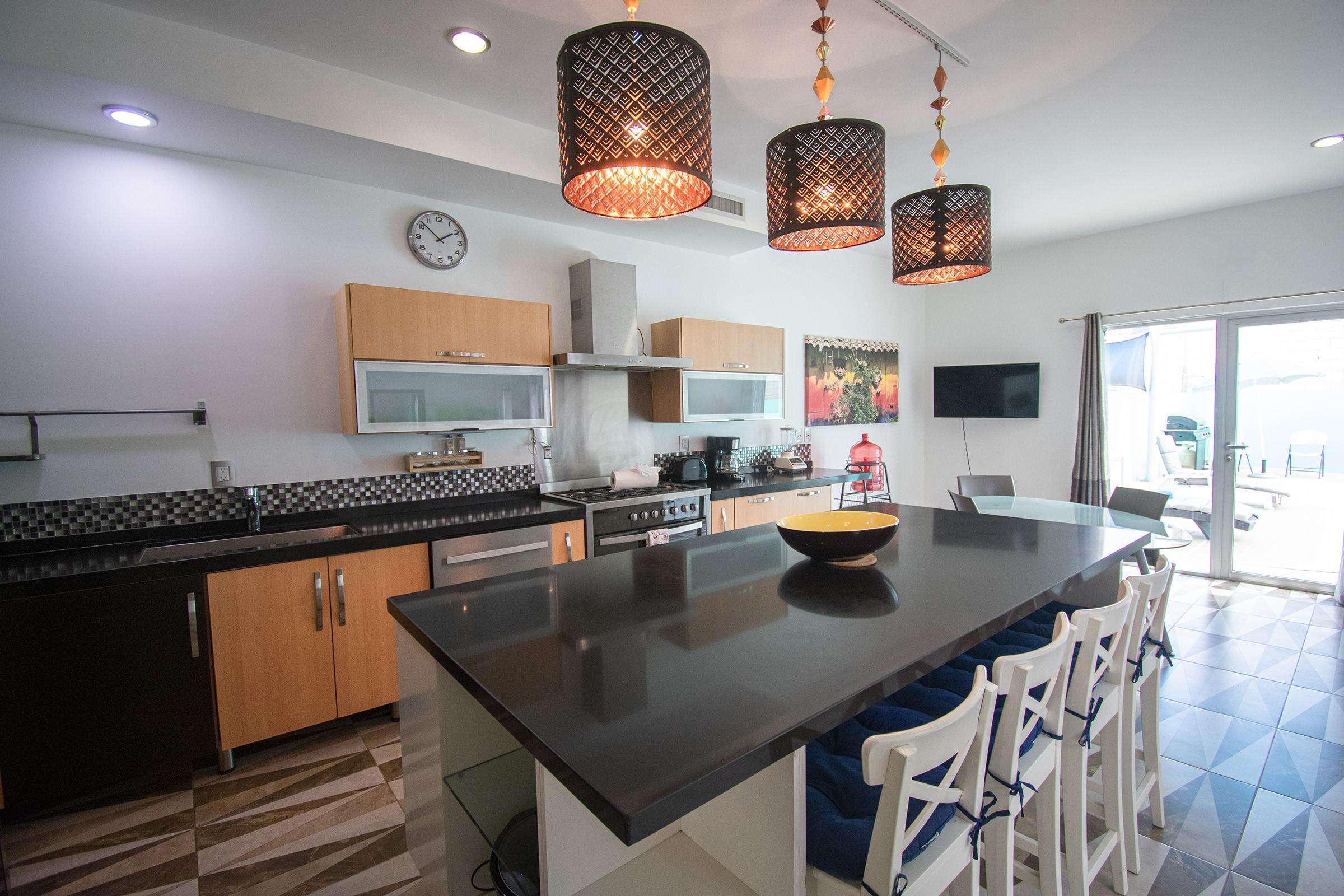 Kitchen fully equipped with refrigerator, stove with oven, microwave, dishwasher,