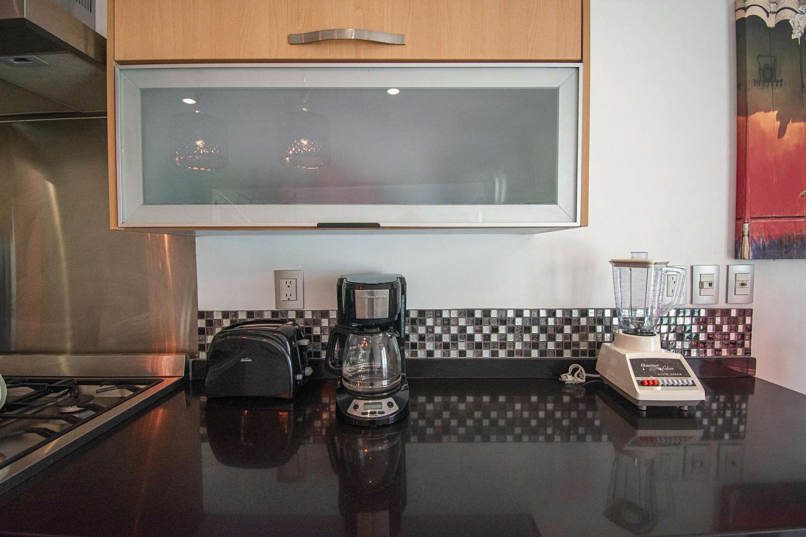 coffee maker and small appliances and dishes.